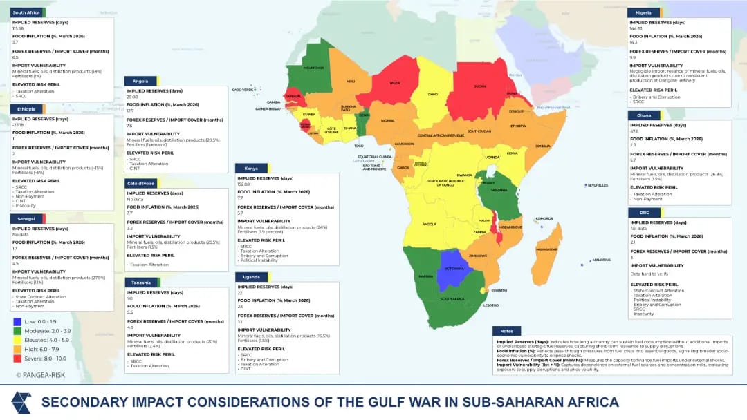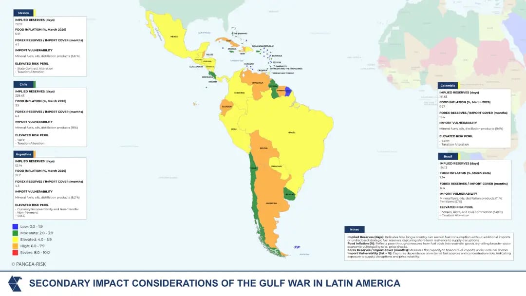 PANGEA‑RISK assesses that the Hormuz disruption now constitutes a structural stress event. Although energy exporters retain sufficient buffers to manage near‑term volatility, import‑dependent economies face rising macroeconomic and political risks driven by higher energy costs, foreign exchange pressure, and tightening financial conditions.