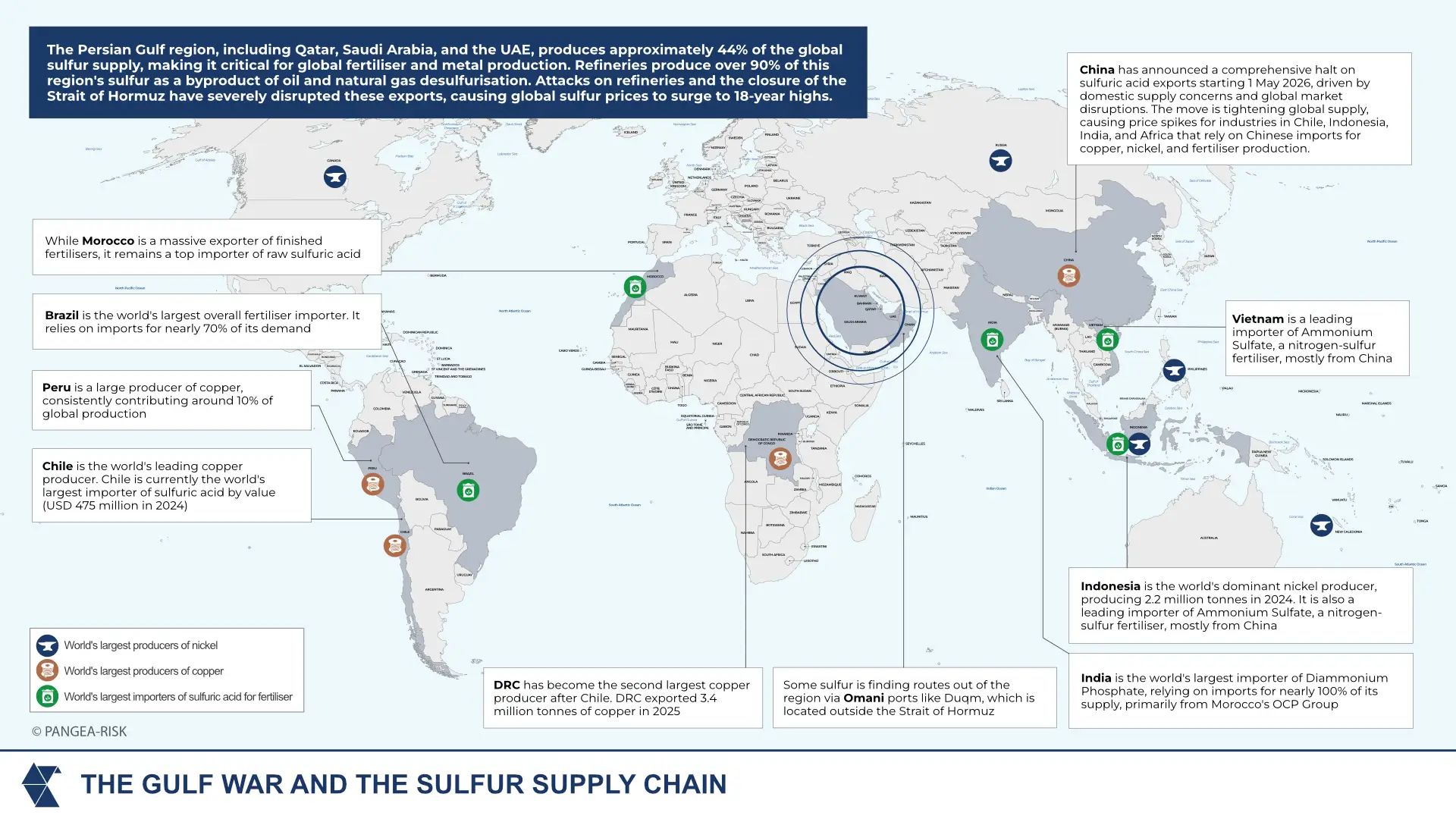 The transmission of these shocks is particularly pronounced in resource‑dependent and import‑reliant economies. Major copper producers such as Chile, Peru, and the Democratic Republic of Congo (DRC) face rising input costs that could erode export competitiveness, while fertiliser‑importing economies such as Brazil and India are exposed to higher agricultural production costs and inflationary pressures. Morocco, despite its position as a leading fertiliser exporter, remains dependent on imported sulfuric acid, creating a vulnerability within its value chain.